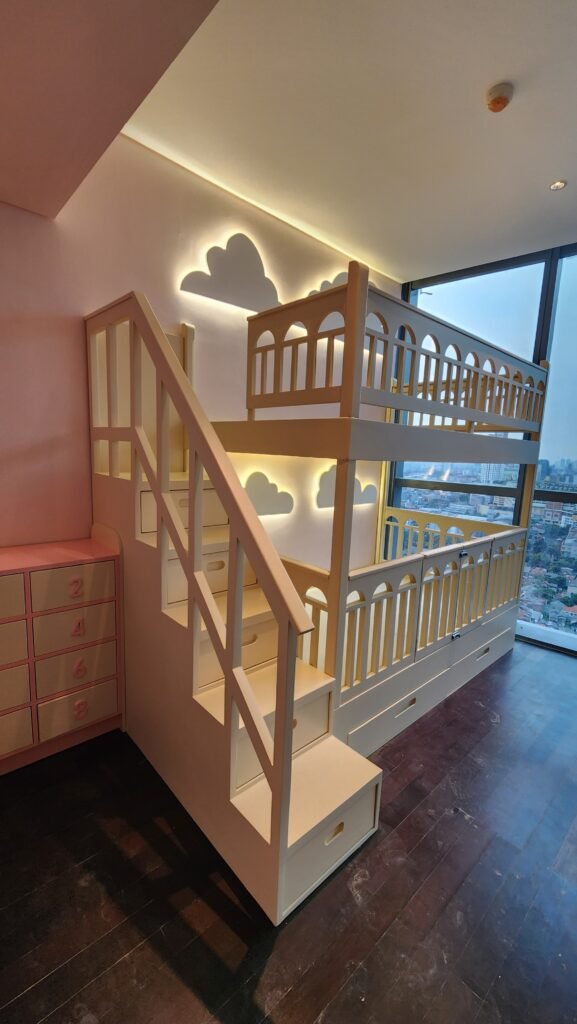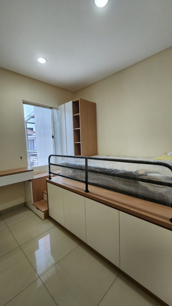 Storage, meja kerja, kabinet, dan elemen built-in yang dibuat sesuai ukuran ruang.